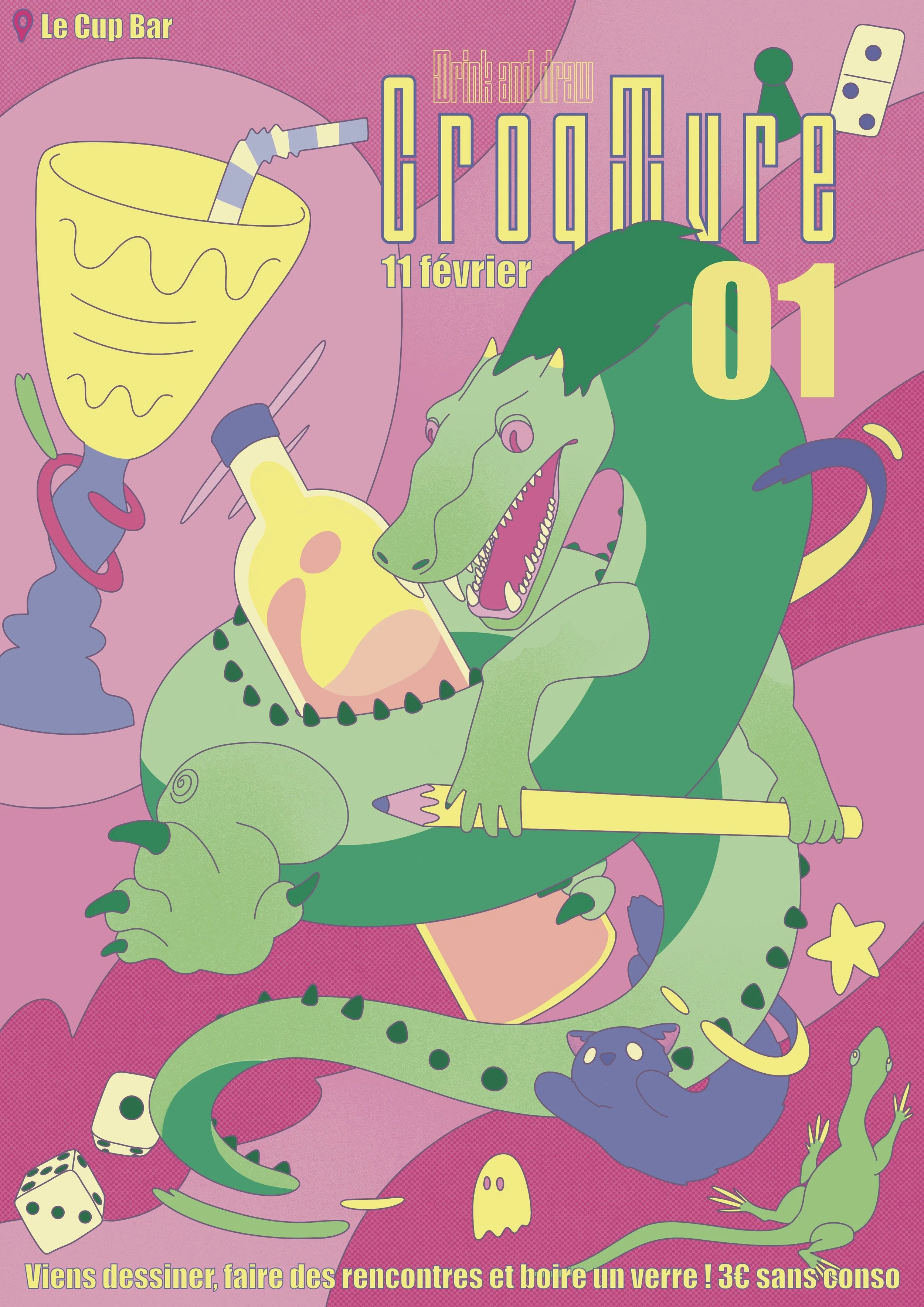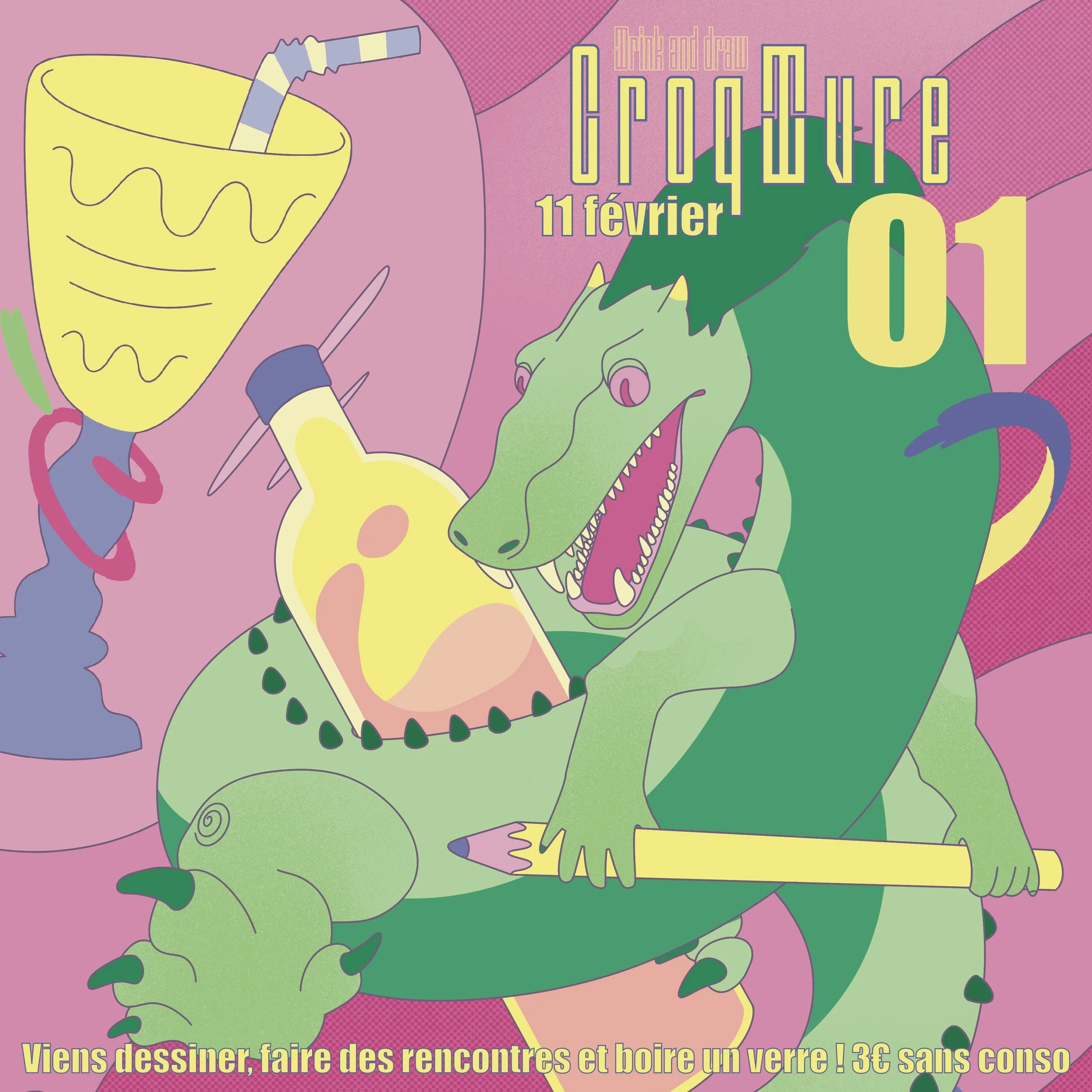 Croqivre est une rencontre informelle et conviviale de dessinateur·ices autour d’un verre, où croquis, partages et bonne humeur sont à l’honneur. Ces événements récurrents rassemblent des passionné·es du dessin dans un cadre détendu, propice à l’échange et à la créativité. J’ai conçu l’identité visuelle du projet, comprenant l’affiche, la charte graphique, ainsi que le design de la mascotte.